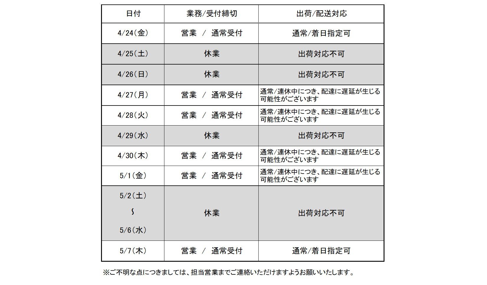 大型連休につき、物流が多くなることから、納期に遅れが出る事が予想されます。
